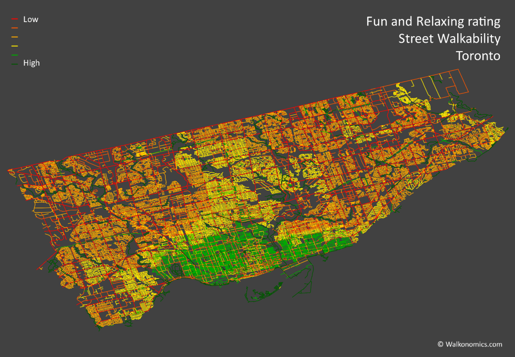 Walkonomics has brought it’s unique way of measuring walkability at street-level to the wonderful city of Toronto.  While other walkability apps only measure how many destinations are within walking distance of a particular location, Walkonomics maps and rates each and every street for eight key walkability factors: