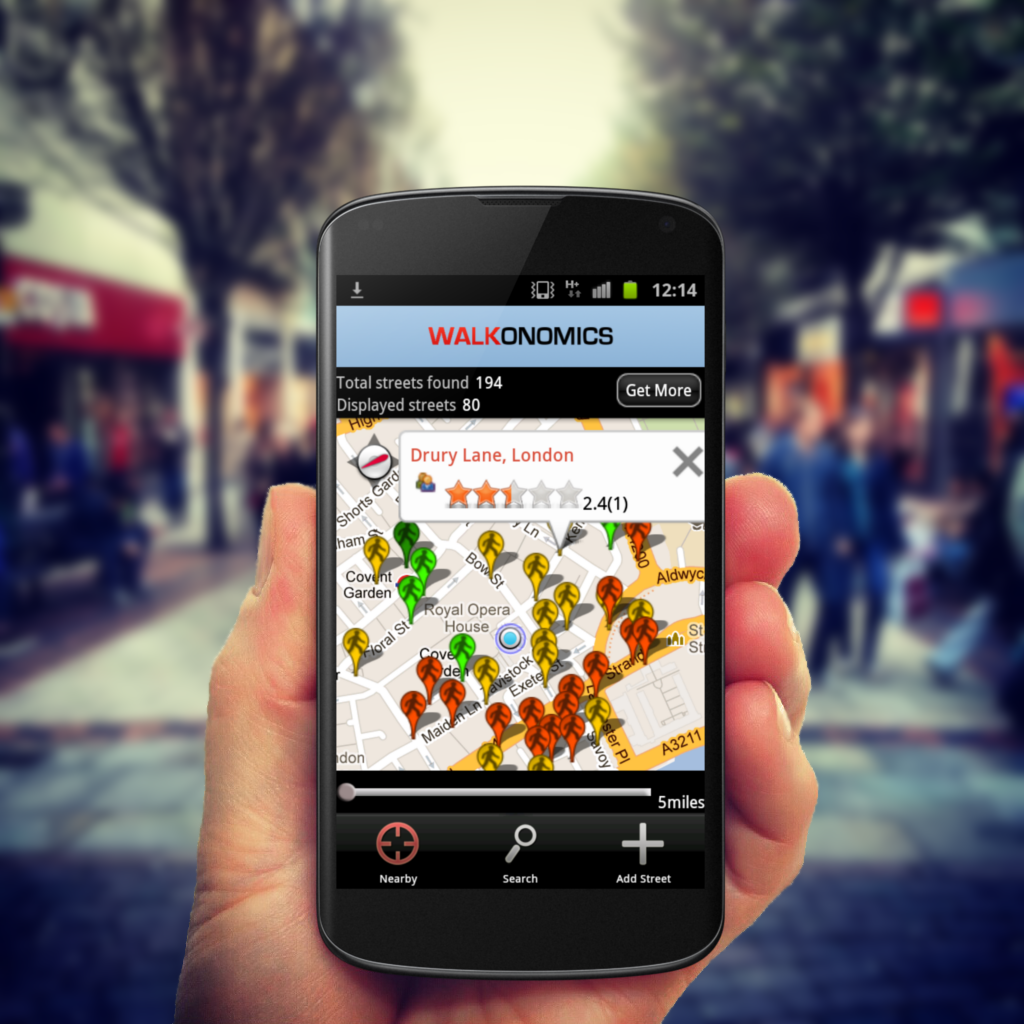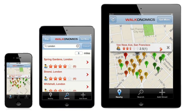 Now a new mobile app from Walkonomics provides an essential tool for the walkable lifestyle.  The Walkonomics app enables people to check the walkability of the street they’re standing in, as well as discover new walkable streets in other areas and add their own reviews.  The free app, which is available for Android devices, uses over 600,000 street ratings from Walkonomics.com, covering every street in San Francisco, New York and England.  But unlike other walkability apps, which only measure how many destinations are within walking distance, the Walkonomics app provides 5-star ratings for 8 different categories of pedestrian-friendliness: